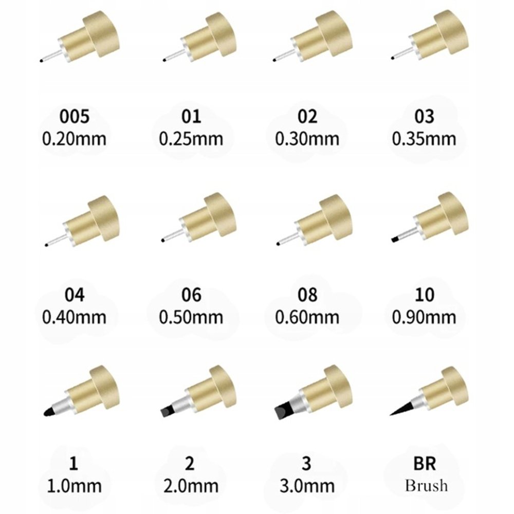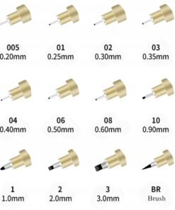 Antgalių dydžiai: 0.05 mm, 0.1 mm, 0.2 mm, 0.25 mm, 0.3 mm, 0.35 mm, 0.4 mm, 0.5 mm, 0.6 mm, 0.9 mm, 1.0 mm, BR (teptuko tipo)
