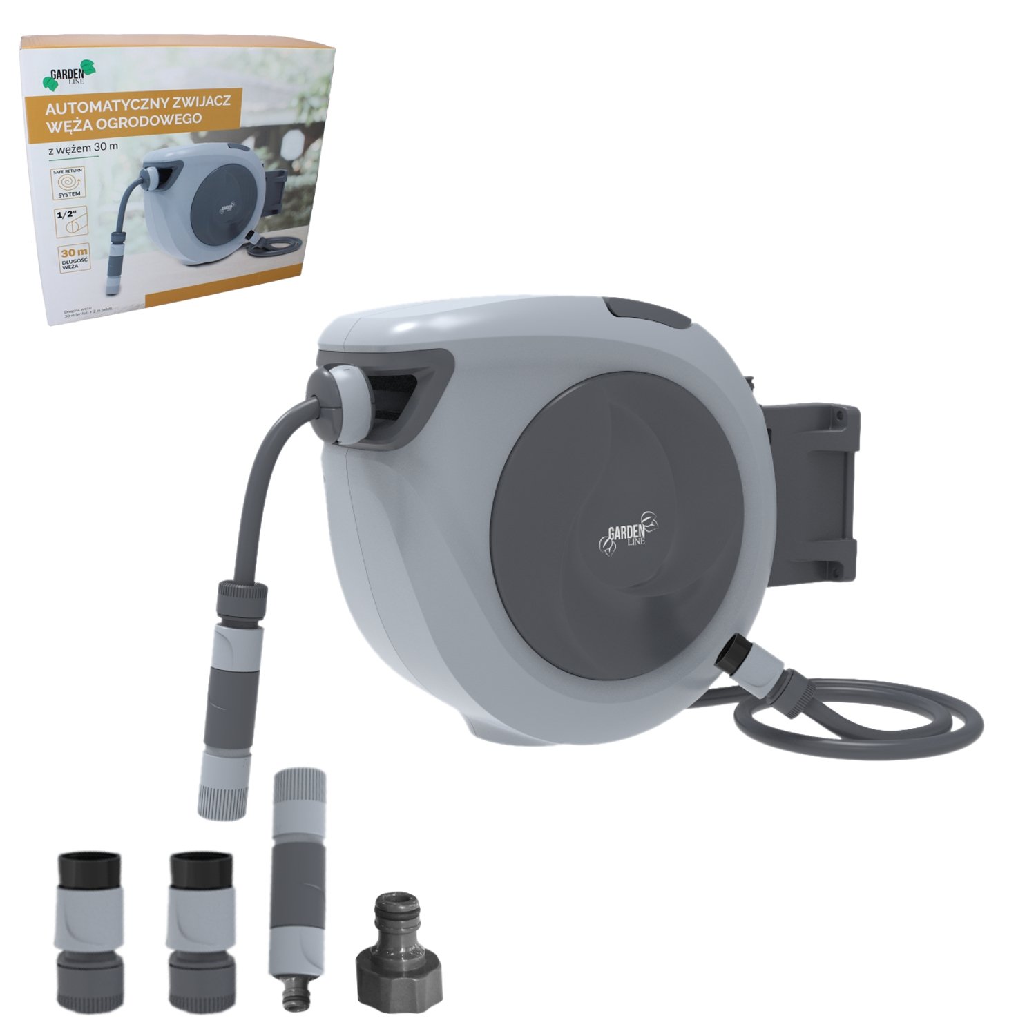 Automatinis sodo žarnos laikiklis su žarna – tai patogus ir praktiškas sprendimas laistymo darbams sode, kieme ar terasoje. Įrenginys užtikrina automatinį žarnos išvyniojimą ir suvyniojimą, todėl laistymas tampa greitesnis, tvarkingesnis ir saugesnis. Integruotas spyruoklinis mechanizmas leidžia lengvai ištraukti reikiamą žarnos ilgį, o automatinė fiksacija palaiko žarną pasirinktoje padėtyje.