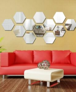 Šešiakampio formos dekoratyvinių lipdukų rinkinys – 12 akrilo veidrodžių, matmenys: 17,5 cm x 15,5 cm. Puikus būdas sutvarkyti tuščią sieną. Veidrodis puikiai tiks kaip optinis erdvės padidinimas.
