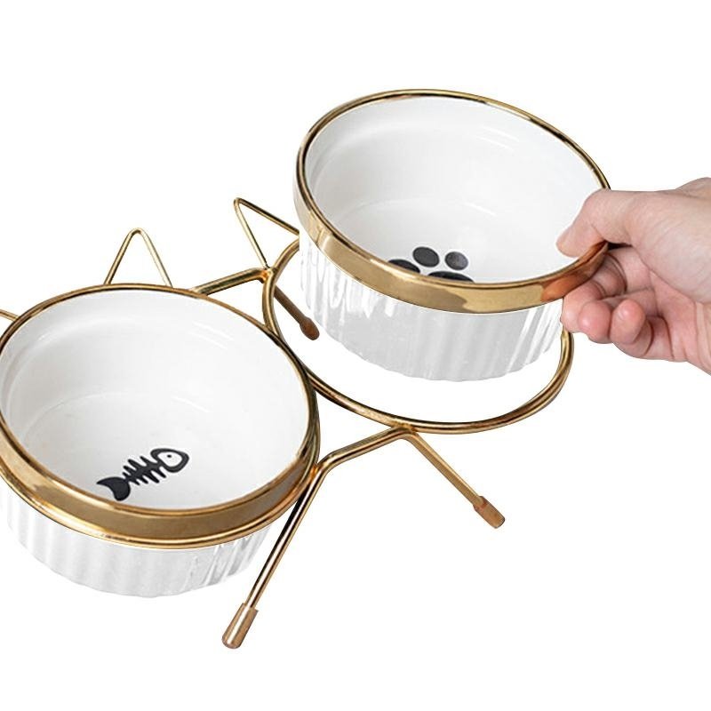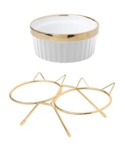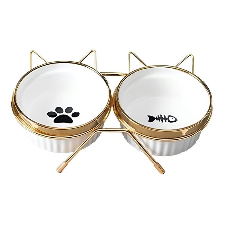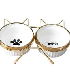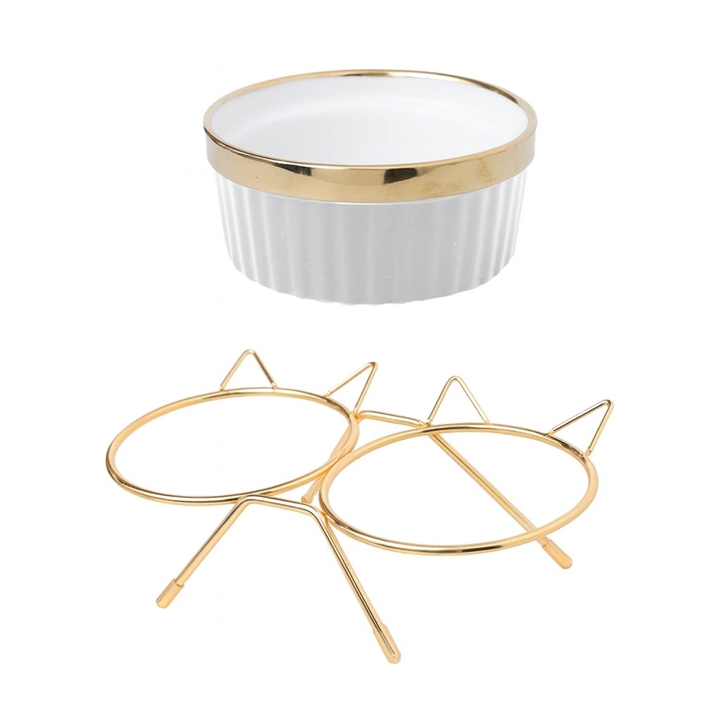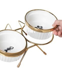 Šis dvigubas keraminis dubenėlis ant metalinio stovo yra elegantiškas ir praktiškas sprendimas katėms ir mažiems šunims. Stabili konstrukcija su auksiniu rėmeliu ir dviem keraminiais dubenėliais užtikrina patogų ir higienišką maisto ar vandens vartojimą. Estetiškai patrauklus dizainas papildo bet kokį namų interjerą.