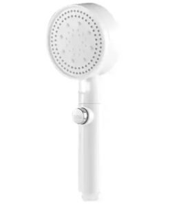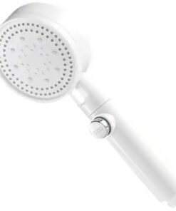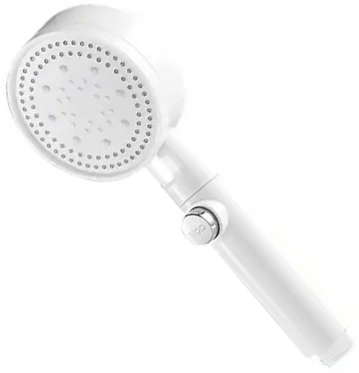 Balta dušo galvutė. Skirta montuoti ant standartinės dušo žarnos. Dušo galvutė turi purškimo režimo pasirinkimo funkciją ir sustabdymo funkciją srovei sustabdyti.