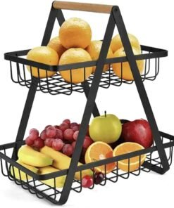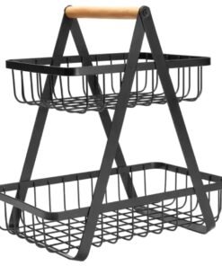 Dviejų pakopų krepšelis – vaisiams ir daržovėms laikyti. Tvirta metalinė konstrukcija ant plataus pagrindo užtikrina aukštą stabilumą. Patogi rankena, padengta medžiu, leidžia lengvai nešti krepšį. Juoda spalva puikiai tinka bet kokiam interjerui ir nėra per daug pastebima.