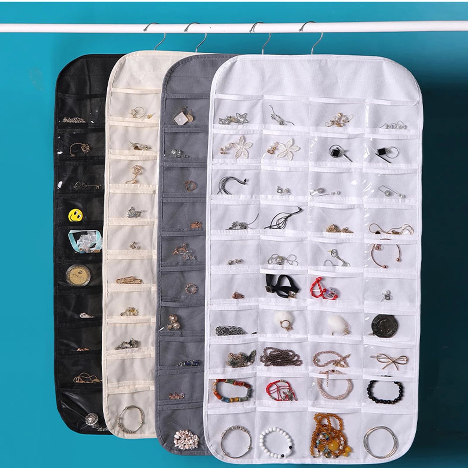 Dvipusis pakabinamas laikymo krepšys su 80 permatomų kišenių plaukų segtams / apyrankėms / asmens tapatybės kortelei / karoliai