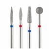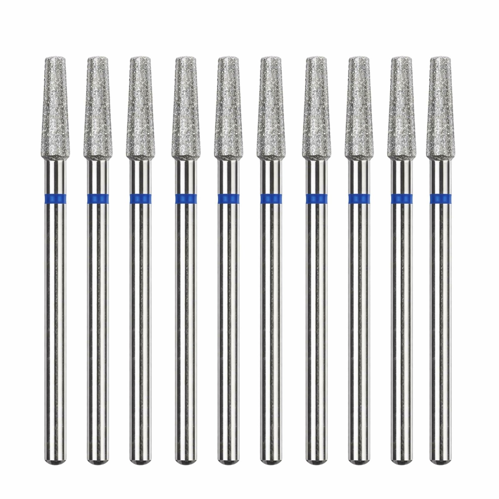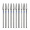 Profesionalus 10 deimantinių antgalių rinkinys apvalaus cilindro formos, idealiai tinkantis tiksliam manikiūrui ir pedikiūrui. Mėlynos žymės rodo vidutinio grūdėtumo paviršių, todėl jie idealiai tinka valyti, lyginti ir formuoti odeles.