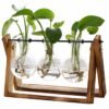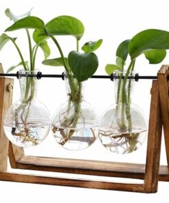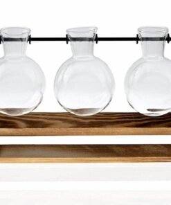 Hidroponinė vaza su trimis stikliniais puodais. Puikiai tinka auginti gėles ir žoleles namuose. Hidroponinė technika yra kultivavimas be dirvožemio, naudojant vandens ir mineralinės druskos tirpalus, kurie leidžia augalams augti nenaudojant dirvožemio. Jame yra estetinis medinis stovas. Jis puikiai tiks kaip vidaus apdaila, parodanti visą augalų šaknų sistemą.