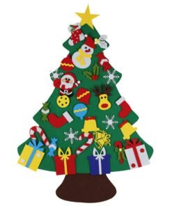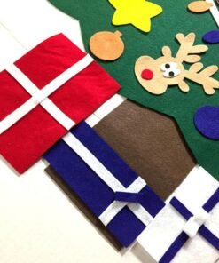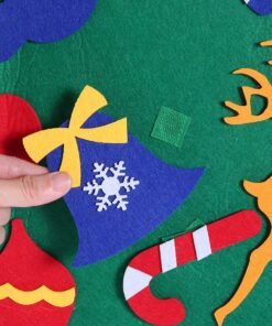 Veltinio medžiagos Kalėdų eglutė vaikams. Puikus žaislas, lavinantis mažiausio kūrybiškumą. Įrengta 30 nuimamų papuošalų, kuriuos galima pritvirtinti ir atsegti bet kurioje eglutės vietoje. Pagaminta iš lengvos ir saugios medžiagos (veltinis). Specialus pakabukas leidžia pakabinti ant sienos.