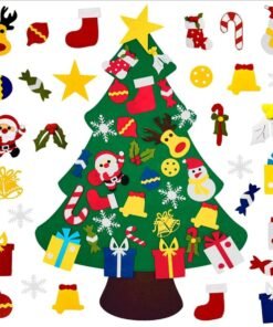 Veltinio medžiagos Kalėdų eglutė vaikams. Puikus žaislas, lavinantis mažiausio kūrybiškumą. Įrengta 30 nuimamų papuošalų, kuriuos galima pritvirtinti ir atsegti bet kurioje eglutės vietoje. Pagaminta iš lengvos ir saugios medžiagos (veltinis). Specialus pakabukas leidžia pakabinti ant sienos.