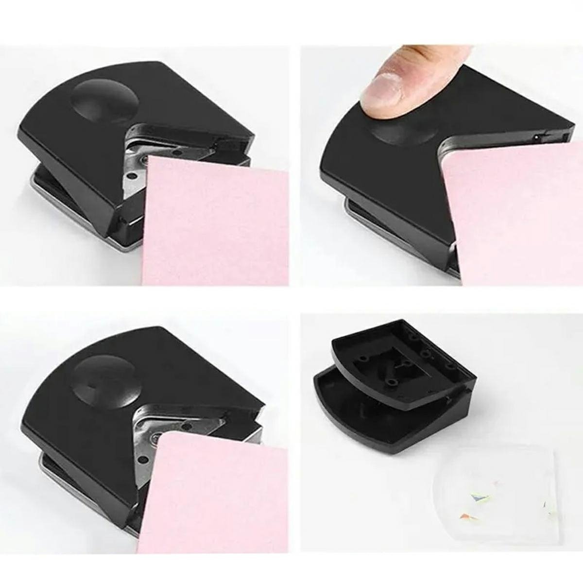 Kampų apvalinimo įrankis laminuotiems dokumentams. Šis kompaktiškas pjaustytuvas leidžia apvalinti kampus 4 mm spinduliu. Plieninis peilis garantuoja tikslų pjovimą be nelygių kraštų. Labai paprasta naudoti – tiesiog paspauskite popieriaus kampą į vidų ir paspauskite mygtuką.