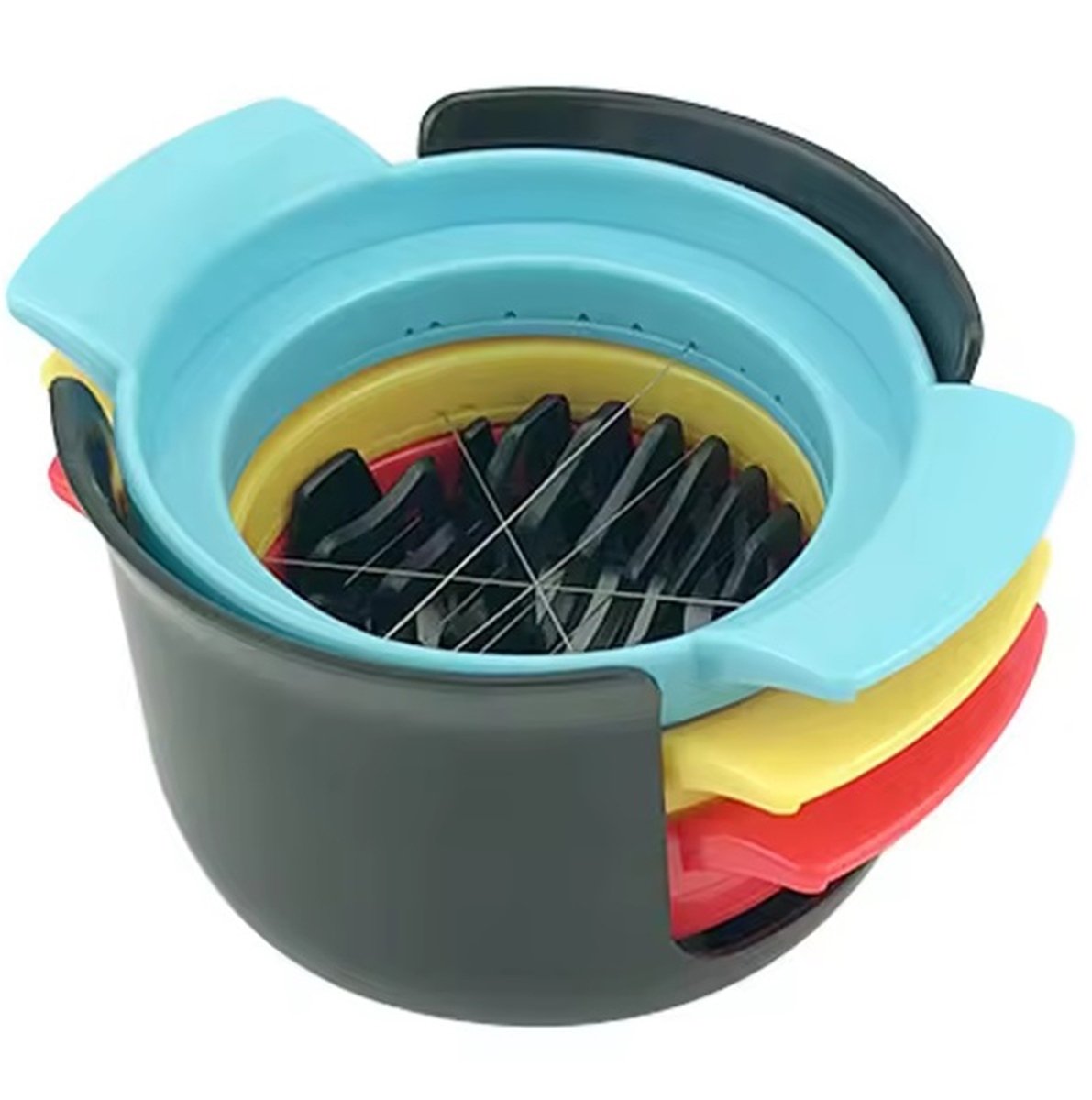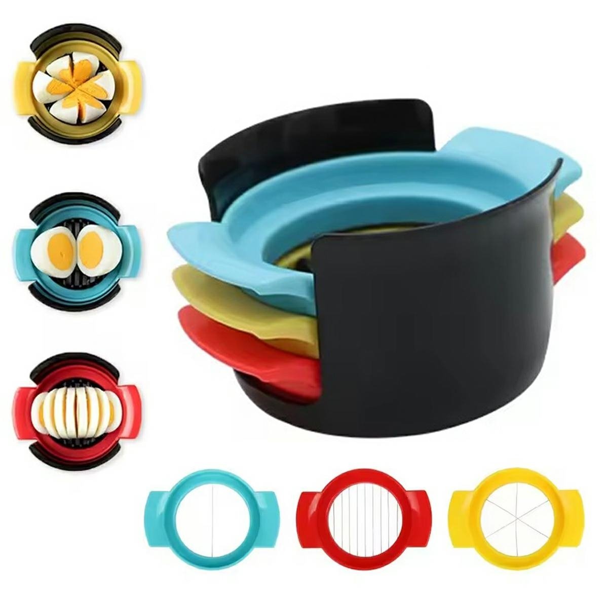 Itin praktiška kiaušinių pjaustyklė – 3 in 1. Ypatinga konstrukcija aprūpinta 3 skirtingais priedais, kurie leidžia kiaušinius pjaustyti skirtingais raštais.