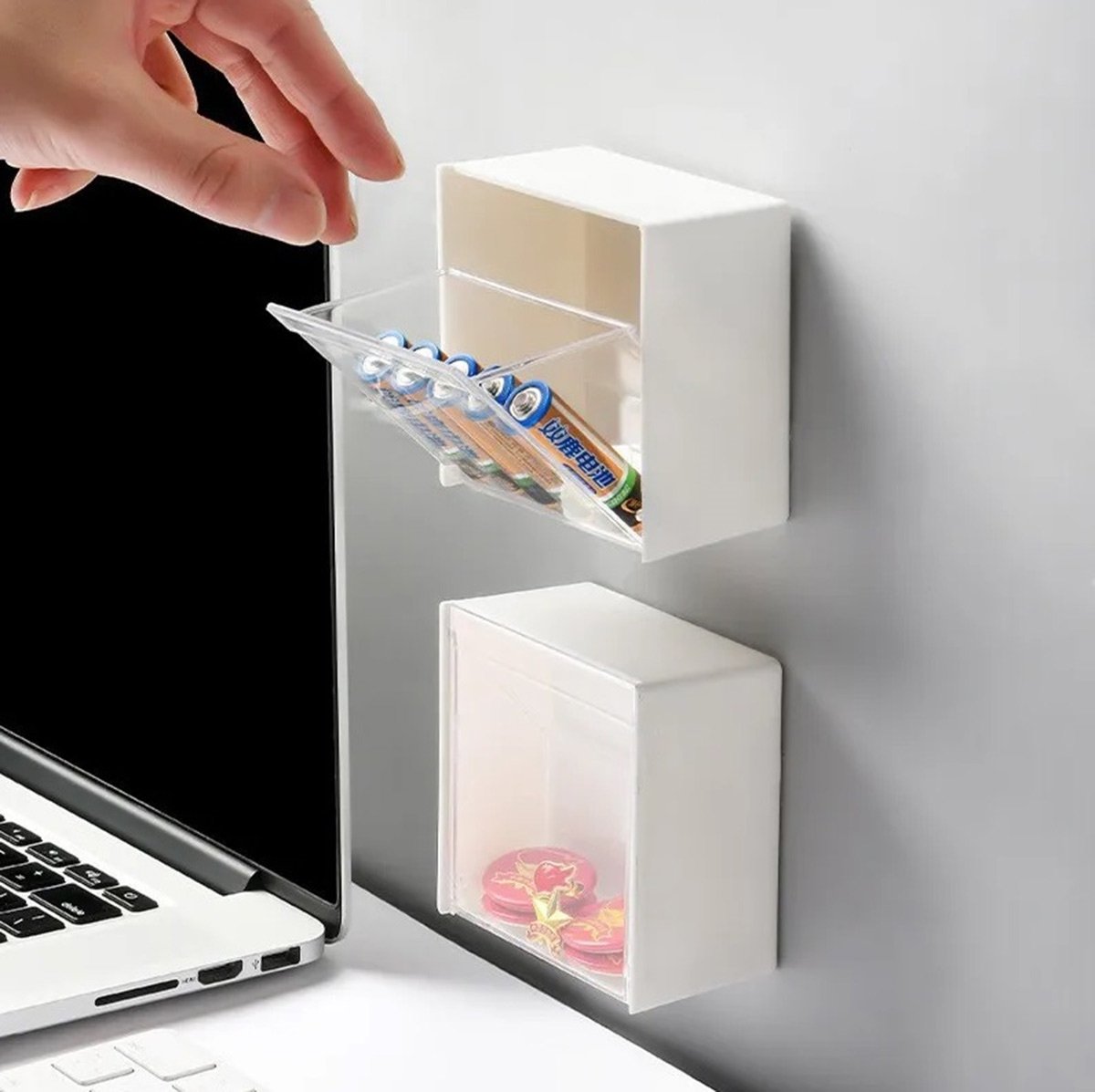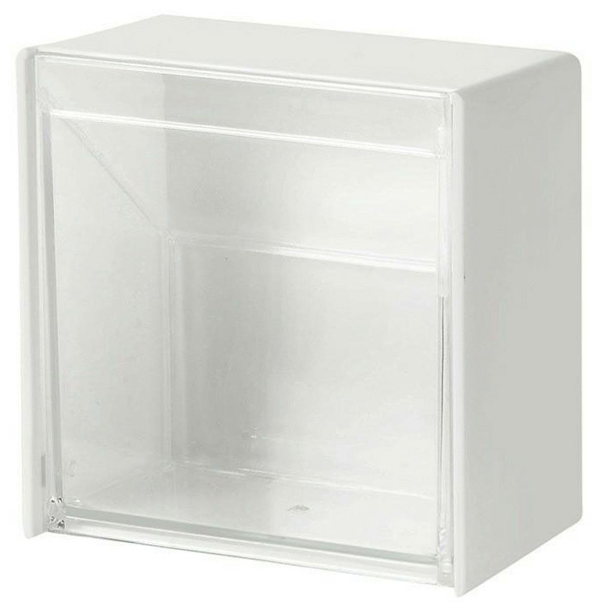 Lipni dėžutė, smulkiems daiktams. Puikus sprendimas mažoms kosmetikos priemonėms ar, pvz., vatos tamponams, laikyti. Patogus, atlenkiamas dangtelis iš skaidrios medžiagos, leidžia lengvai matyti turinį. Neinvazinis montavimas ant sienos naudojant lipnią juostą.