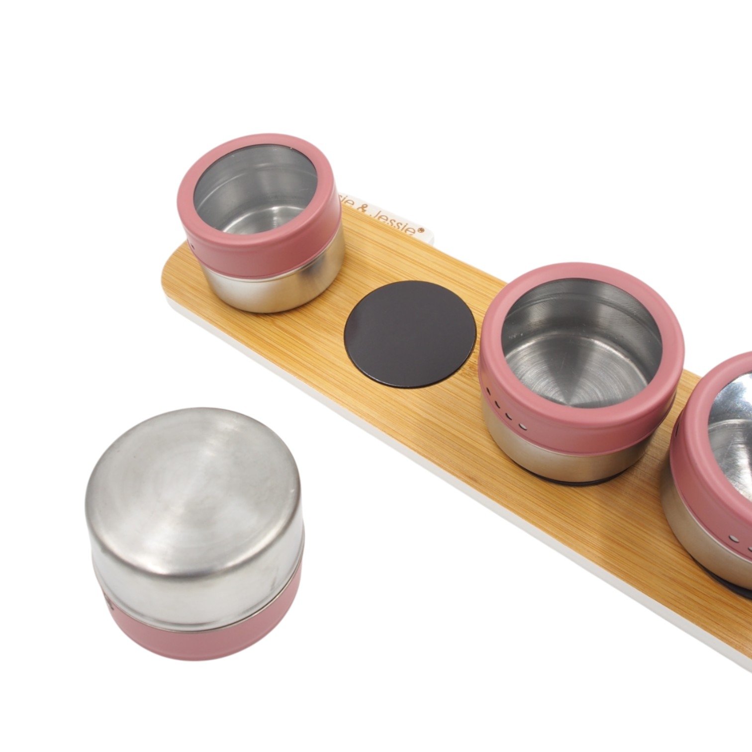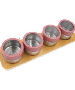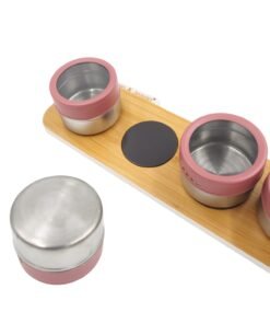 Rinkinį sudaro: 4 prieskonių indeliai + bambukinis magnetinis stovas