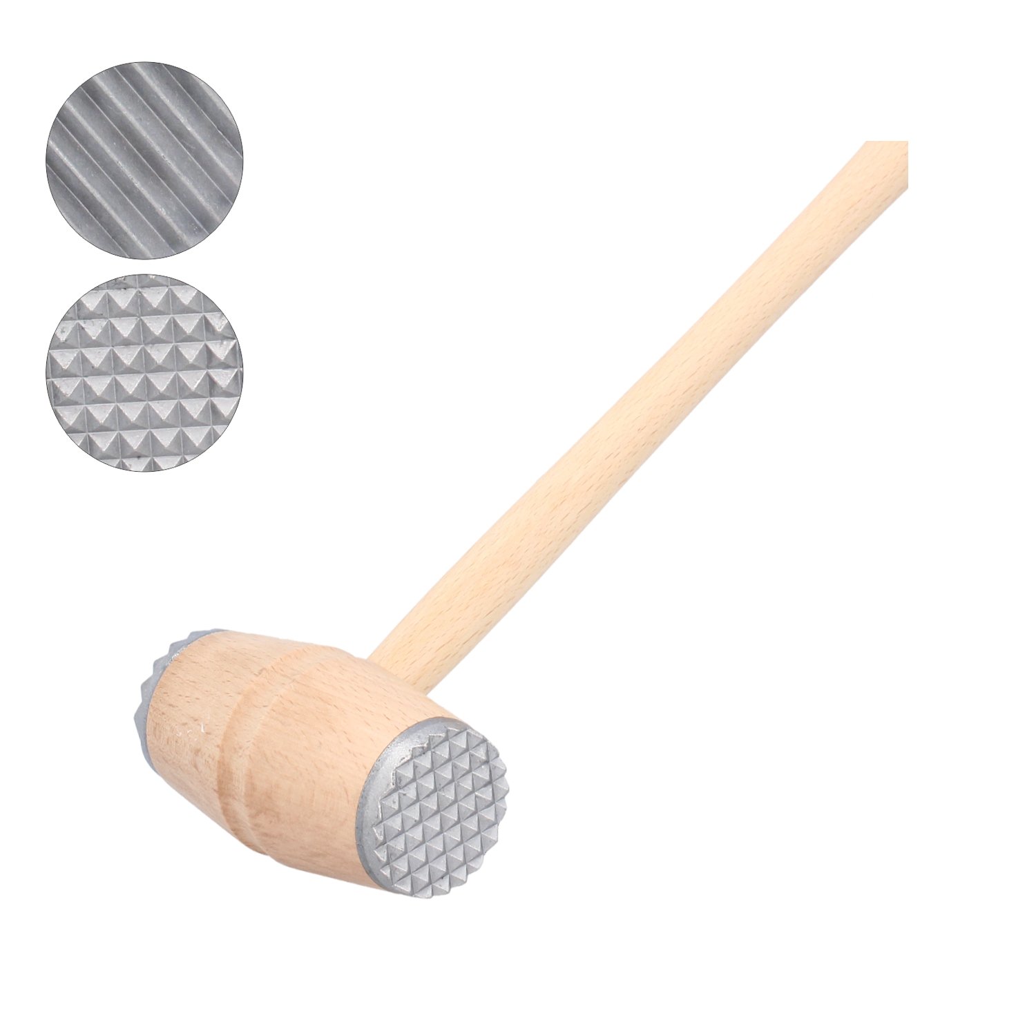 Tvirtas ir patogus medinis mėsos plaktukas, skirtas mėsos minkštinimui ir ploninimui prieš kepimą ar troškinimą. Dvi skirtingos metalinės plokštumos leidžia pasirinkti tinkamą apdorojimo būdą – viena pusė skirta intensyvesniam minkštinimui, kita – švelnesniam išlyginimui. Ilga rankena užtikrina patogų laikymą ir gerą kontrolę darbo metu.