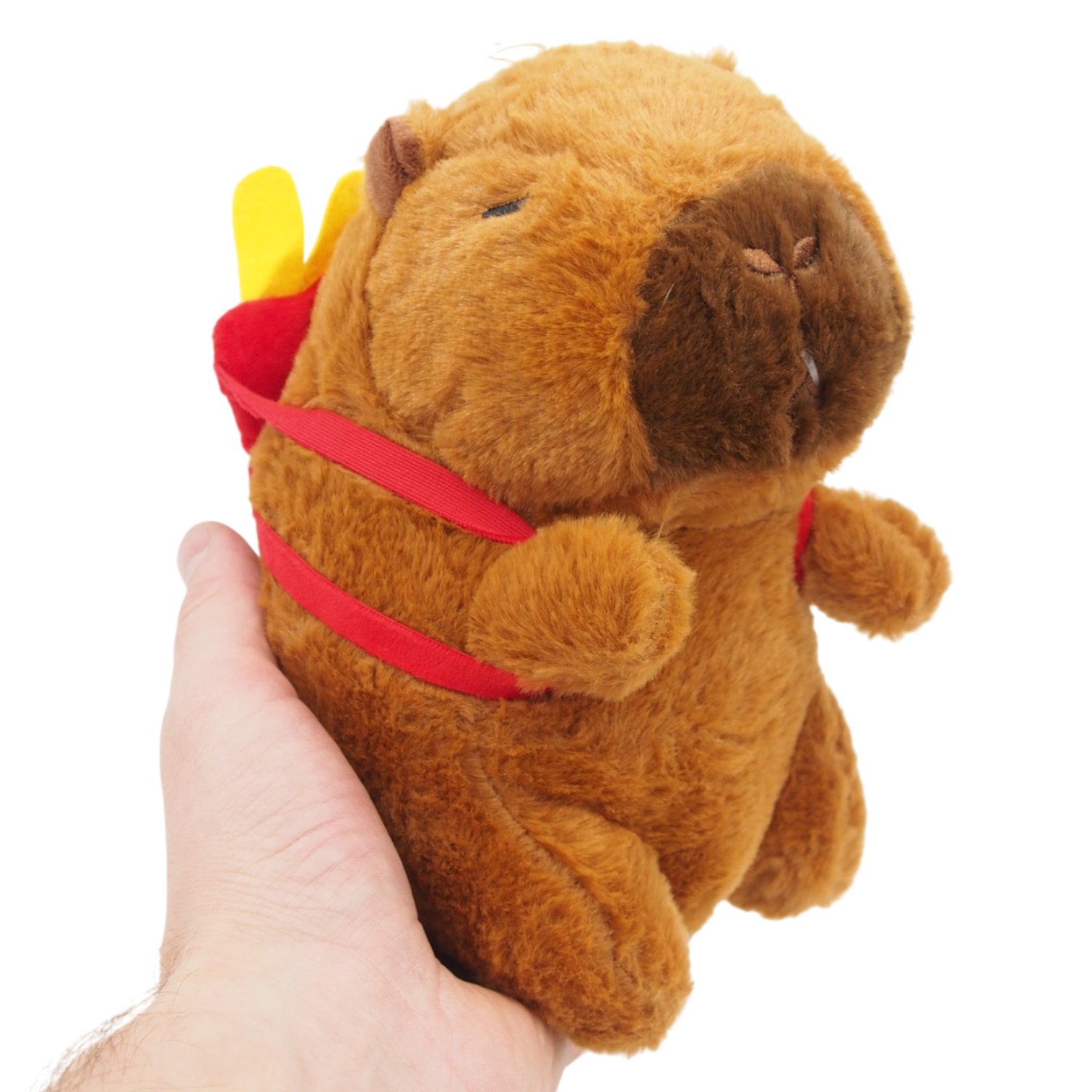 Ši linksma pliušinė kapibara su raudona bulvyčių kuprine iš karto privers nusišypsoti! Švelnus kailiukas, miela veido išraiška ir išskirtinės detalės daro ją ne tik puikiu žaislu, bet ir originalia dovana kapibarų gerbėjams.