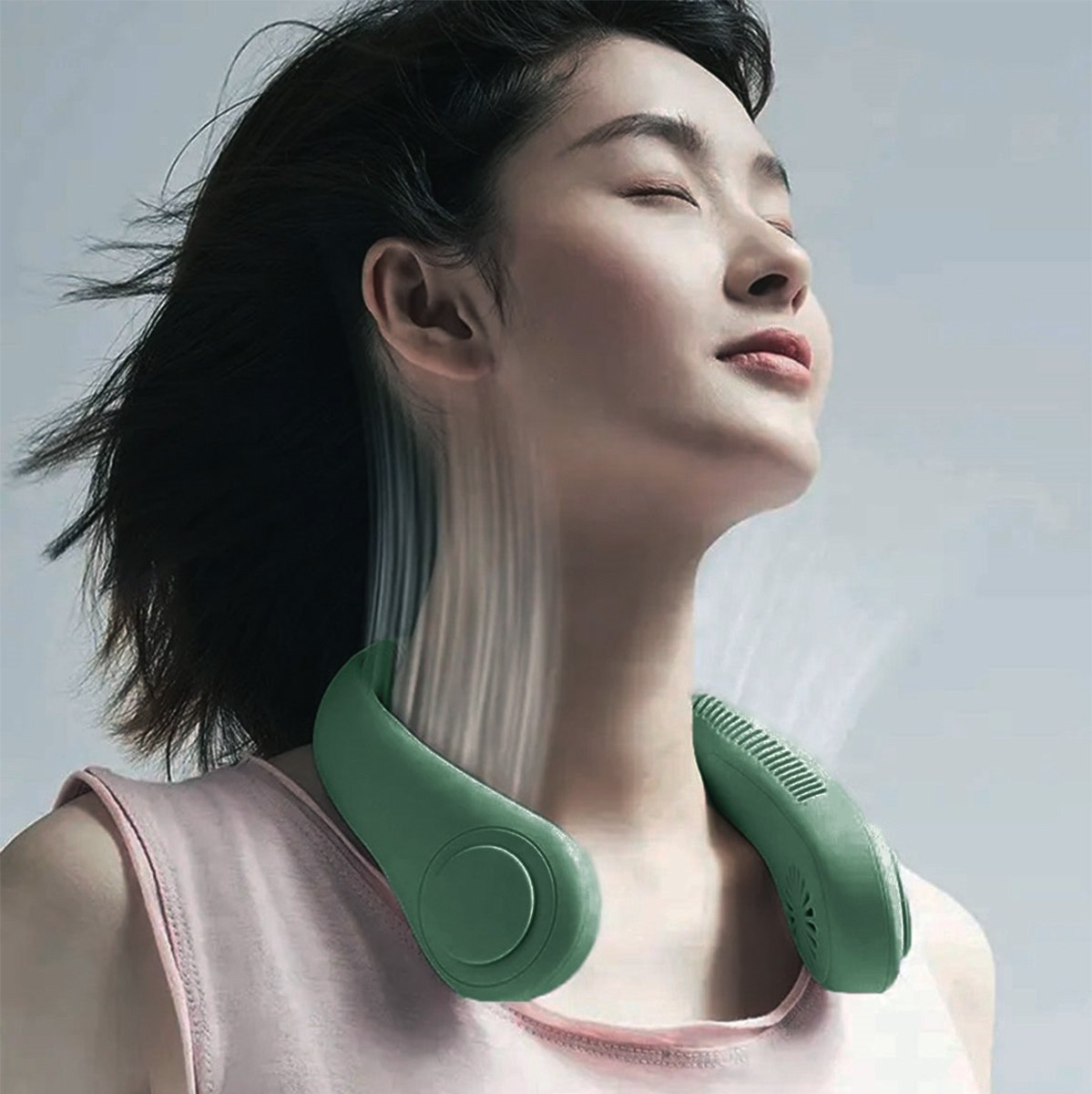 Kompaktiškas nešiojamas ventiliatorius. Dėl išmanaus ausinių formos dizaino jį patogu pakabinti ant kaklo. Puikiai tinka kelionėms ir namams (dėl įmontuoto stovo). Maitinamas įmontuota baterija, įkraunama per USB laidą. Galima reguliuoti oro srauto greitį (3 greičiai). Nepakeičiamas dirbant kompiuteriu karštomis dienomis.