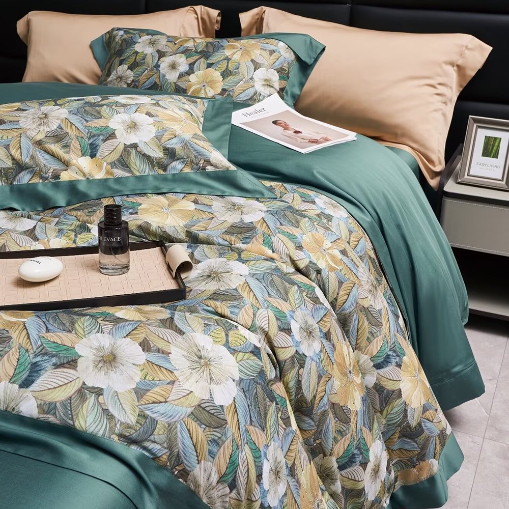 Pasinerkite į tropinę poilsio oazę su šiuo išraiškingu patalynės komplektu, alsuojančiu gyvybe, gamta ir subtilia prabanga. Gėlėmis ir lapais išmargintas raštas, nuspalvintas žalios, smėlinės, aukso ir žydros tonais, suteikia miegamajam ne tik išskirtinio žavesio, bet ir gaivos pojūtį. Tai idealus pasirinkimas tiems, kurie nori į savo kasdienybę įnešti šiek tiek saulėtos egzotikos.