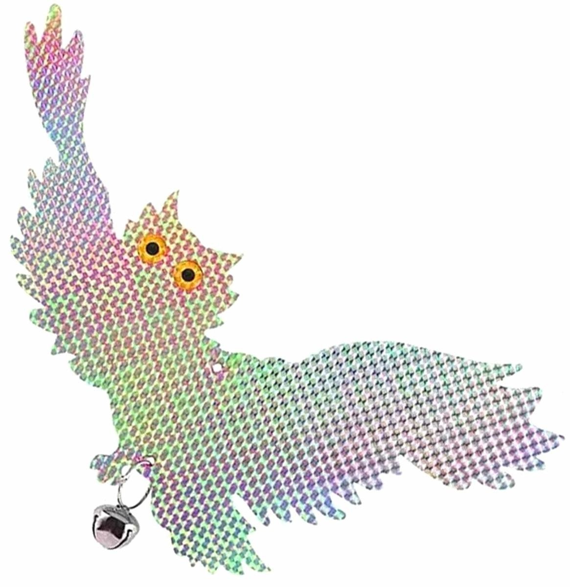 Atspindintis skraidančios pelėdos formos paukščių baidyklė. Puikiai atbaido nepageidaujamus paukščius dėl holografinės dangos, sukuriančios trimačio įspūdį. Du papildomi varpeliai apačioje, kurie sustiprina atgrasantį poveikį. Gaminys skirtas pakabinti ant tam skirtos virvelės viršutinėje dalyje. Puikiai tinka apsaugoti pasėlius ir namų sodus.