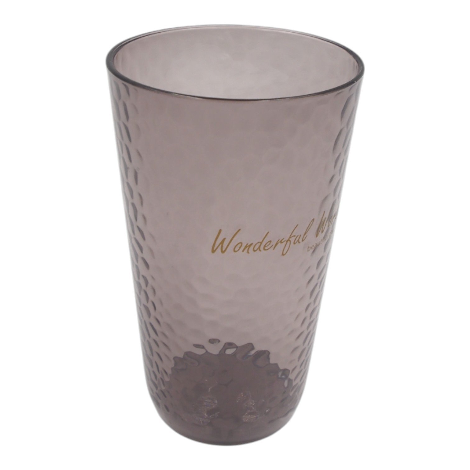 Stilinga plastikinė stiklinė su dailiu faktūriniu paviršiumi ir subtiliu užrašu „Wonderful World“. Pagaminta iš tvirto plastiko, todėl yra lengva, saugi naudoti tiek namuose, tiek išvykose ar piknikuose. Permatomas dūminis atspalvis suteikia modernumo ir elegancijos, o plaktos tekstūros paviršius padeda patogiai laikyti stiklinę rankoje.