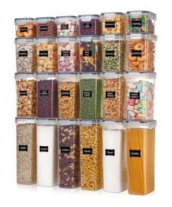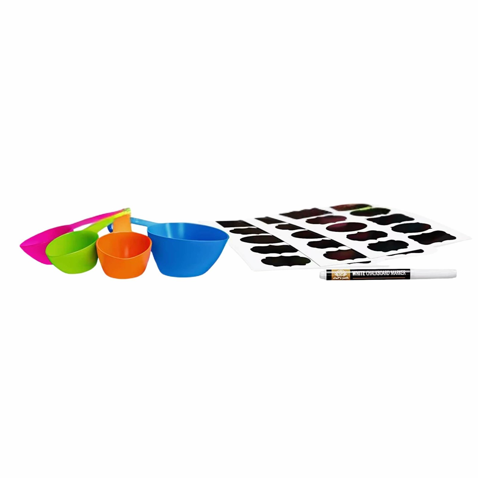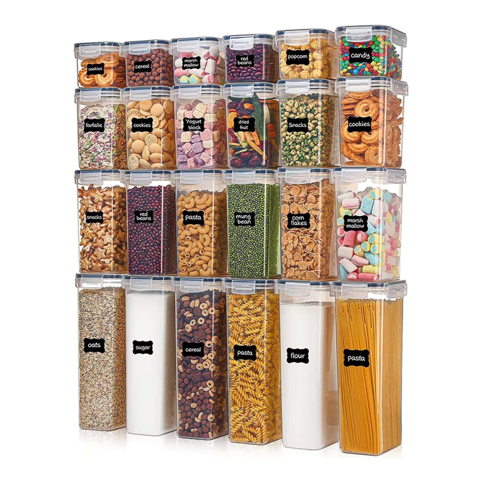 24 plastikinių virtuvės indelių rinkinys yra praktiškas sprendimas maistui laikyti. Rinkinį sudaro keturi dydžiai, todėl juos lengva pritaikyti įvairiems maisto produktams. Be to, rinkinyje yra trys lipdukų lapai ir žymeklis, skirtas lengvam ženklinimui.