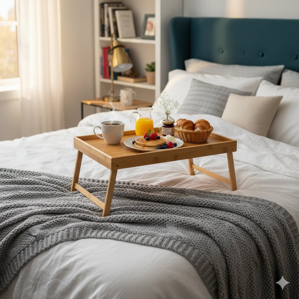 Mėgaukis ramiu rytmečiu su pusryčiais lovoje arba patogia darbo vieta su nešiojamu kompiuteriu neišlipant iš lovos! Šis bambukinis pusryčių staliukas su sulankstomomis kojelėmis – praktiškas, stilingas ir universalus sprendimas namams.