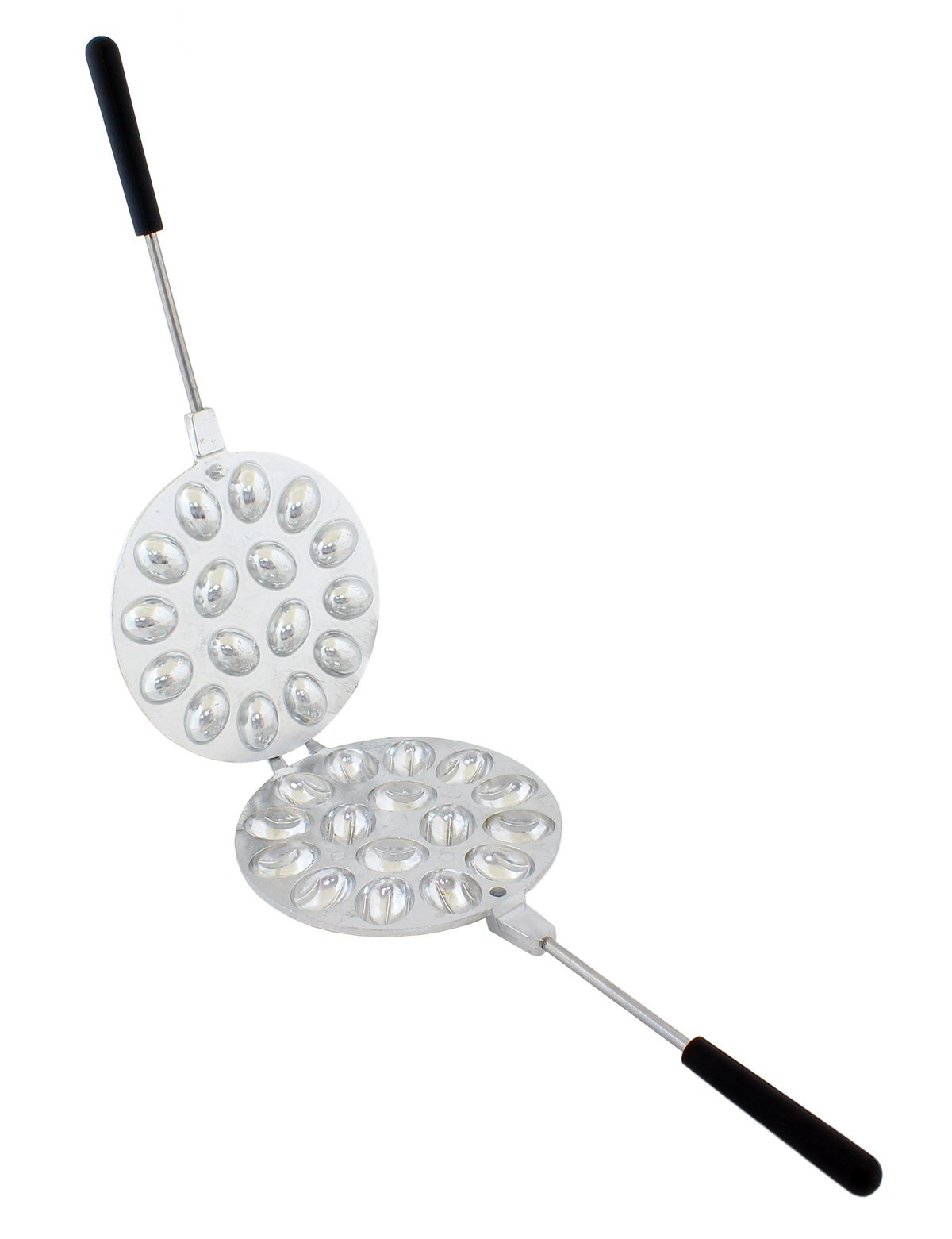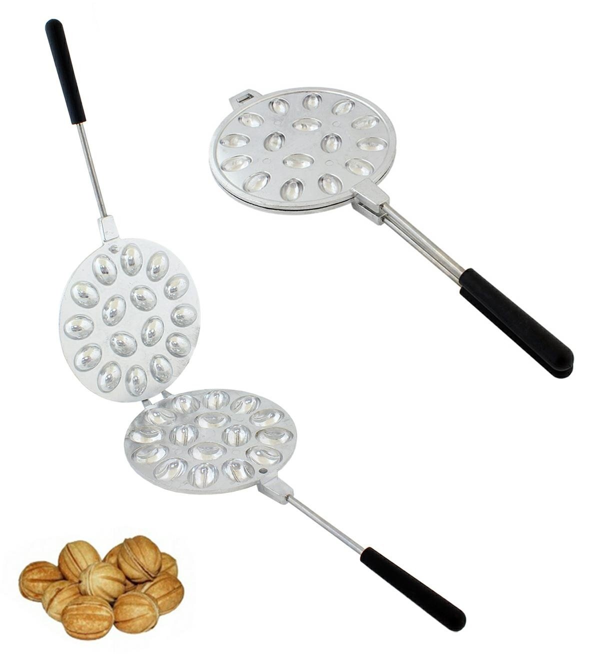 Metalinė forma graikinių riešutų formos sausainiams kepti! Naudojant specialų lydinį, forma greitai įkaista ir ilgai išlaiko šilumą. Turi dvi tvirtas rankenas, kurios apsaugo rankas nuo nudegimų ir palengvina tvarkymą. Forma leidžia vienu metu iškepti 16 puselių graikinių riešutų. Sukurta dujinėms viryklėms!