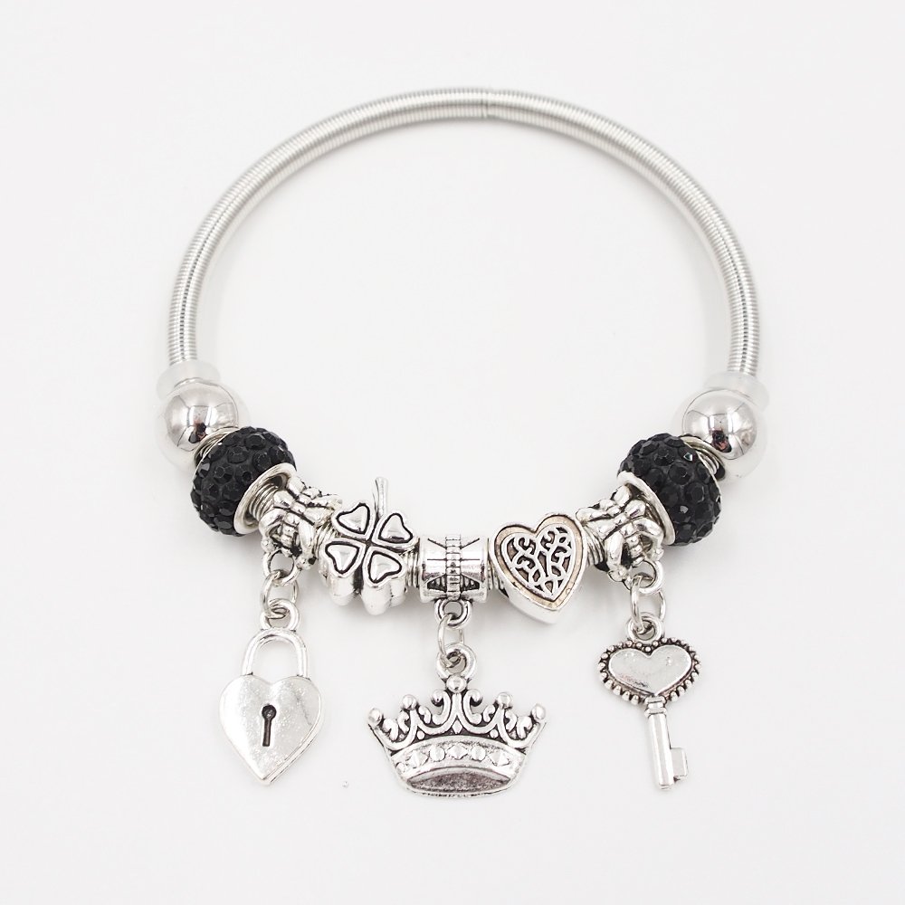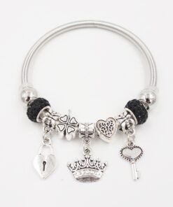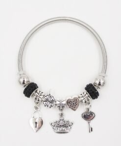 Ši elegantiška sidabrinės spalvos apyrankė išsiskiria kontrastingais juodais akcentais, kurie suteikia jai modernumo ir subtilios prabangos pojūtį. Tamsūs elementai simbolizuoja stiprybę, paslaptingumą ir apsaugą, o sidabriniai pakabukai prideda spindesio bei išskirtinumo.