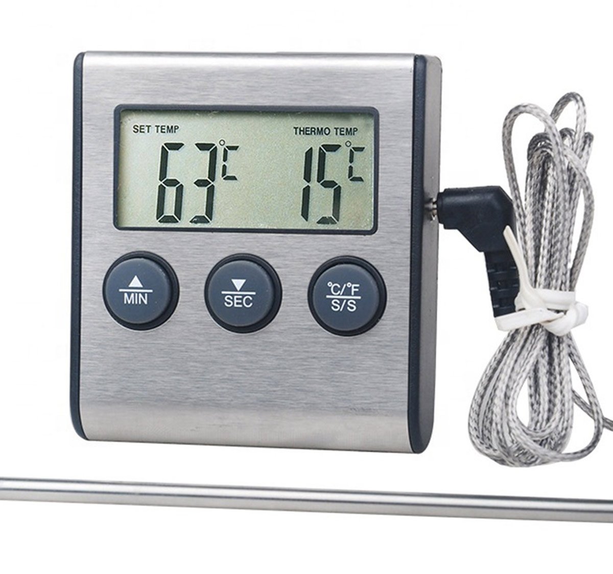Elektroninis termometras su karščiui atspariu zondu. Puikiai tinka temperatūrai matuoti ant grotelių, rūkykloje ir dujinėse bei elektrinėse orkaitėse. Būtinas, kai viryklėje nėra įmontuoto temperatūros indikatoriaus. Prietaisas turi aiškų LCD ekraną, kuris palengvina matavimų skaitymą. Ilgas laidas ir karščiui atsparus smaigalio formos zondas leidžia lengvai įdėti jį net į maistą ir išmatuoti mėsos temperatūrą. Termometras taip pat turi iki 99 minučių skalės laikmatį ir garsą, signalizuojantį, kad laikas praėjo ir pasiekiama deklaruota temperatūra. Šis puikus įrankis leis daug lengviau kontroliuoti kepamo maisto temperatūrą.