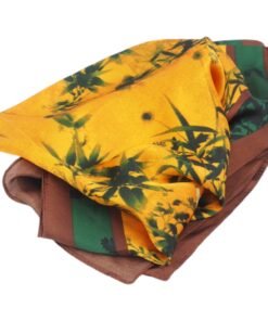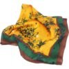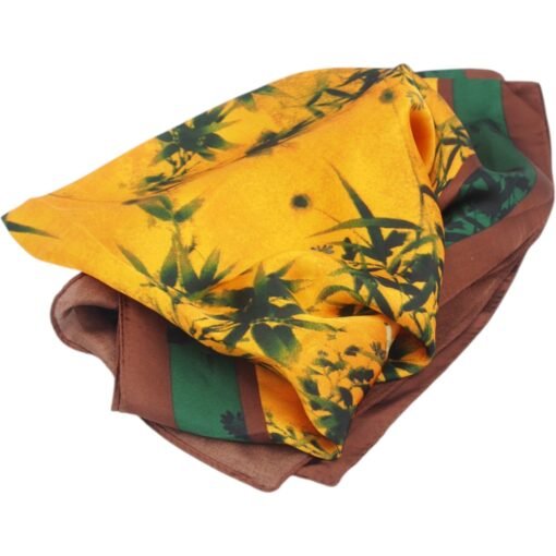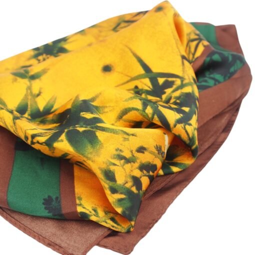 Skarelę puošia sodrių spalvų paletė – švytintis geltonas fonas dera su sodriai žaliais ir rudais atspalviais, o augalų motyvai sukuria įspūdį tarsi žvelgtumėte į saulės nušviestą pievą. Šis gamtos įkvėptas dizainas puikiai tinka pavasariui, vasarai ar rudeniui – kaip kaklo papuošalas, galvos aksesuaras ar stilingas akcentas prie rankinės.