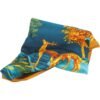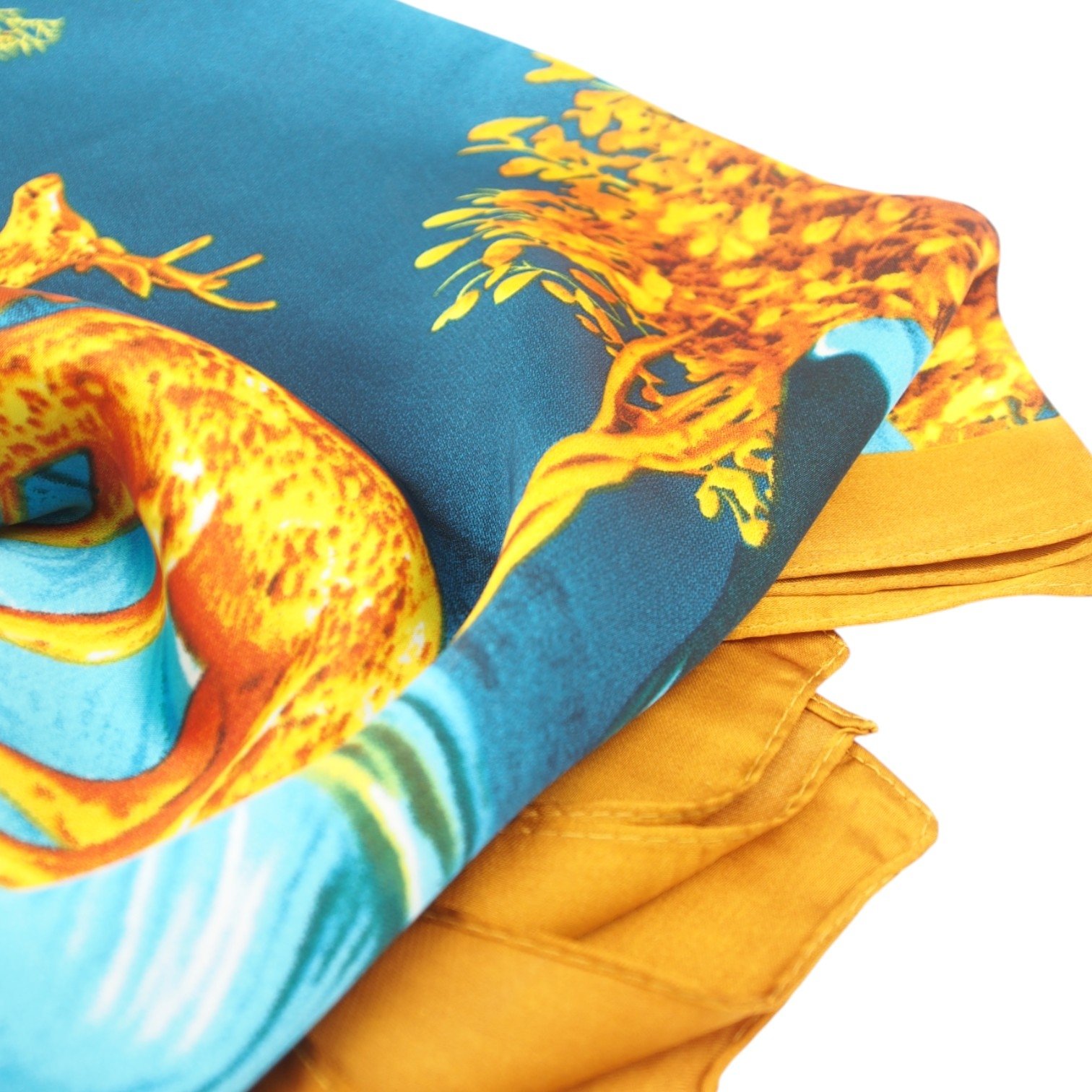 Spalvinga ir išraiškinga – ši 70×70 cm dydžio skarelė išsiskiria savo meniniu dizainu, kuriame vaizduojama gamtos scena su dviem auksiniais elniais, medžiais ir vandens motyvais. Ryškūs mėlynos, oranžinės ir geltonos spalvų deriniai sukuria įspūdingą vaizdą, kuris traukia akį ir suteikia išskirtinumo bet kokiam įvaizdžiui.