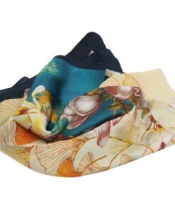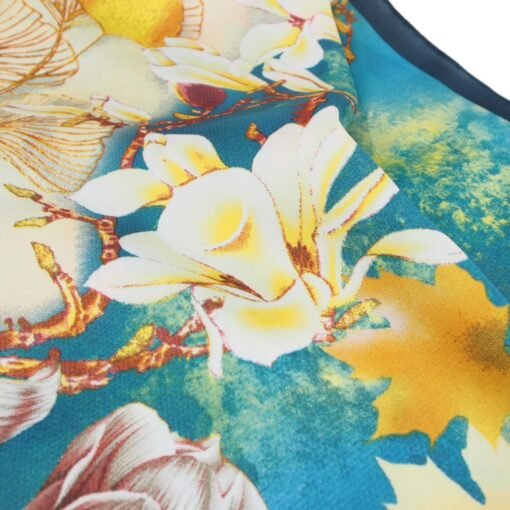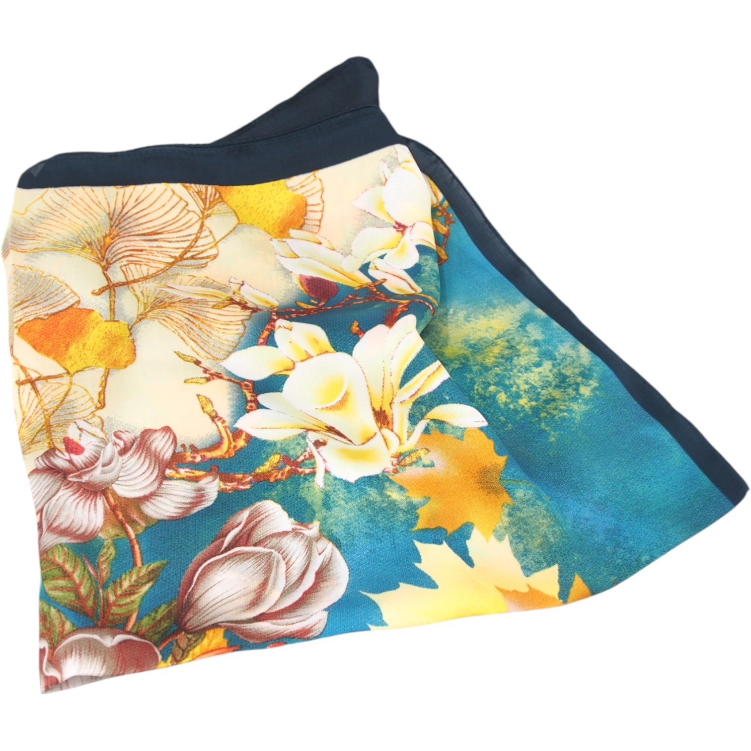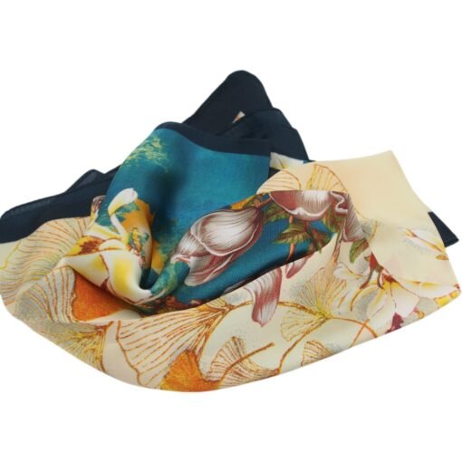 Ši 70×70 cm dydžio skarelė – tai išties meniškas ir išskirtinis aksesuaras, įkvėptas gamtos grožio. Skarelės dizainą puošia subtilūs žiedai – magnolijos, rožės bei lapų motyvai, kurių spalvos pereina nuo šiltų auksinių atspalvių iki sodrių mėlynų tonų. Tamsiai mėlynas kraštelis suteikia kompozicijai elegantišką užbaigtumą.