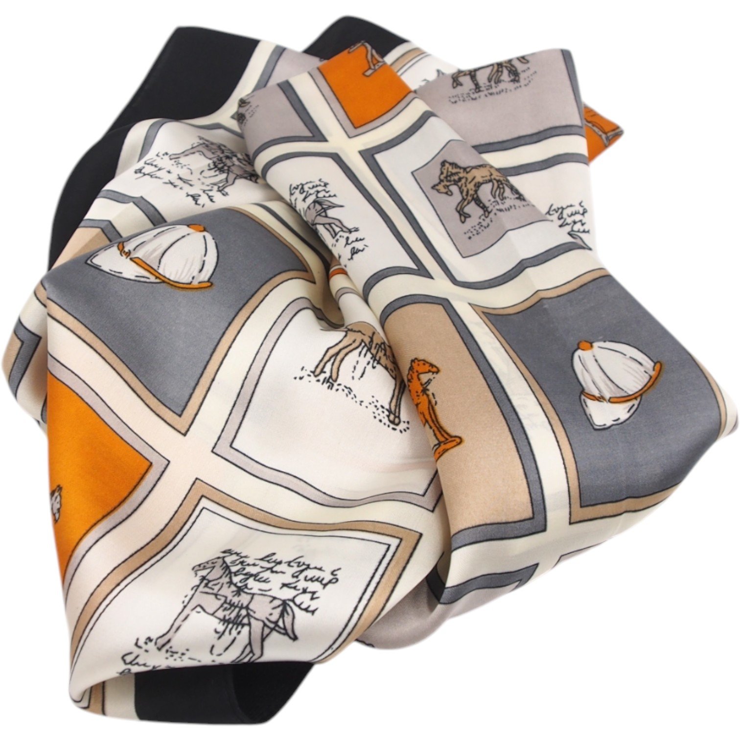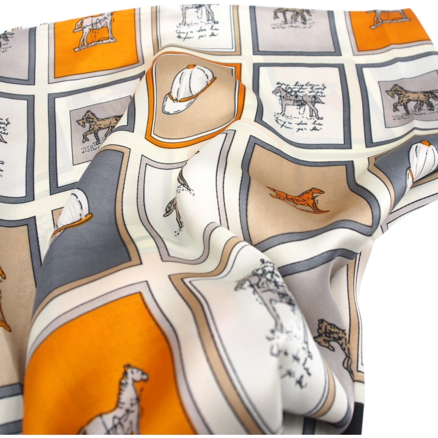 Prabangiai atrodanti skarelė – puikus aksesuaras ieškančioms išskirtinumo. Ryškių oranžinių, pilkų ir rusvų spalvų derinys su žirgų bei jojimo tematikos motyvais sukuria išskirtinį, klasikinį įvaizdį. Puikiai dera tiek prie elegantiškos aprangos, tiek kaip akcentas kasdieniame stiliuje – galima rišti ant kaklo, plaukų ar rankinės rankenos.