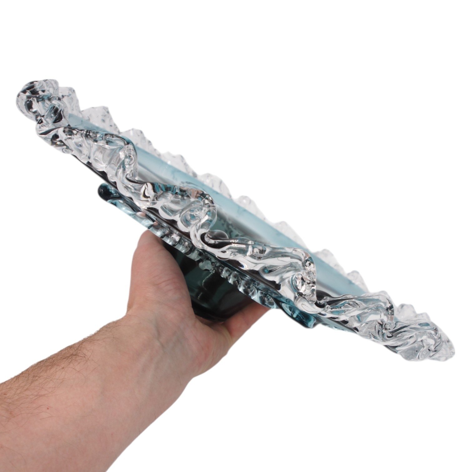 Modernus stiklinis dubuo – elegantiškas ir išskirtinis akcentas Jūsų namų interjerui. Permatomo stiklo ir žydro atspalvio derinys su unikaliomis formomis sukuria įspūdingą kompoziciją, kuri ne tik papuoš stalą ar komodą, bet ir taps traukos centru.