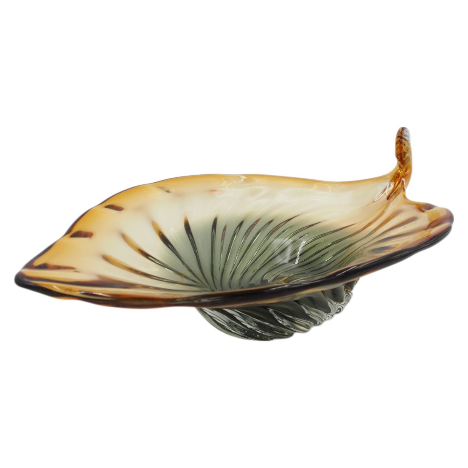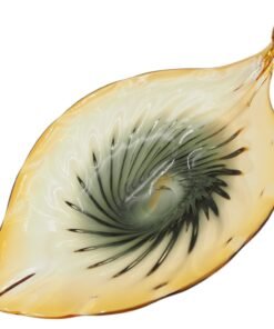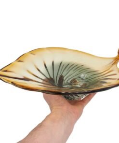 Išskirtinio dizaino, rankų darbo stiklinis indas – puošnus akcentas Jūsų interjerui. Subtilūs gintaro ir žalios spalvos tonai susilieja unikaliame, gamtos formų įkvėptame dizaine, suteikdami elegancijos ir išskirtinumo bet kuriam stalui ar komodai. Tinka naudoti kaip vaisinę, centrinę stalo dekoraciją ar tiesiog stilingą interjero detalę.