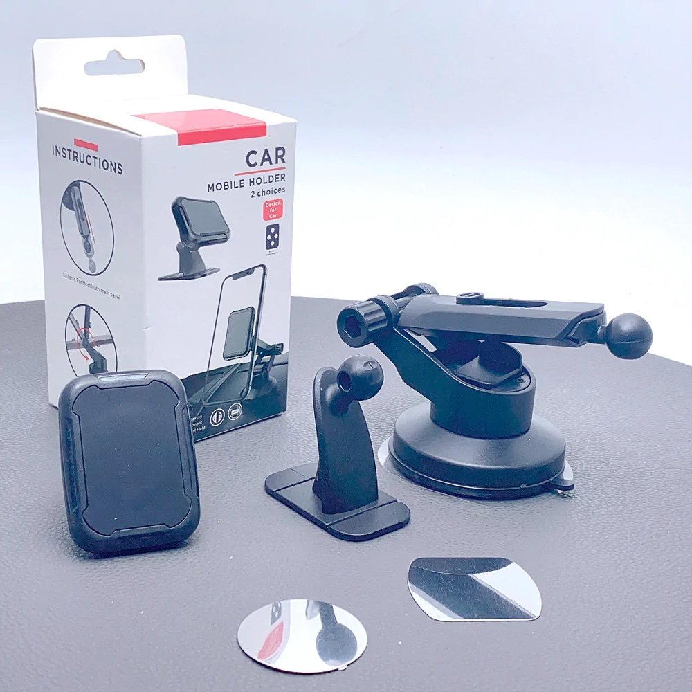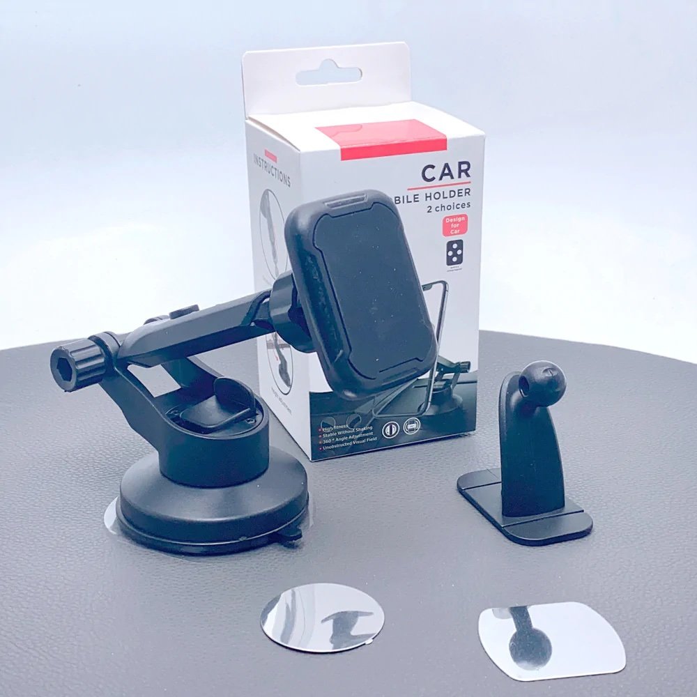 Rinkinyje du skirtingi laikikliai skirti tvirtinti prie automobilio stiklo arba klijuoti prie panelės dvipusio lipduko pagalba.