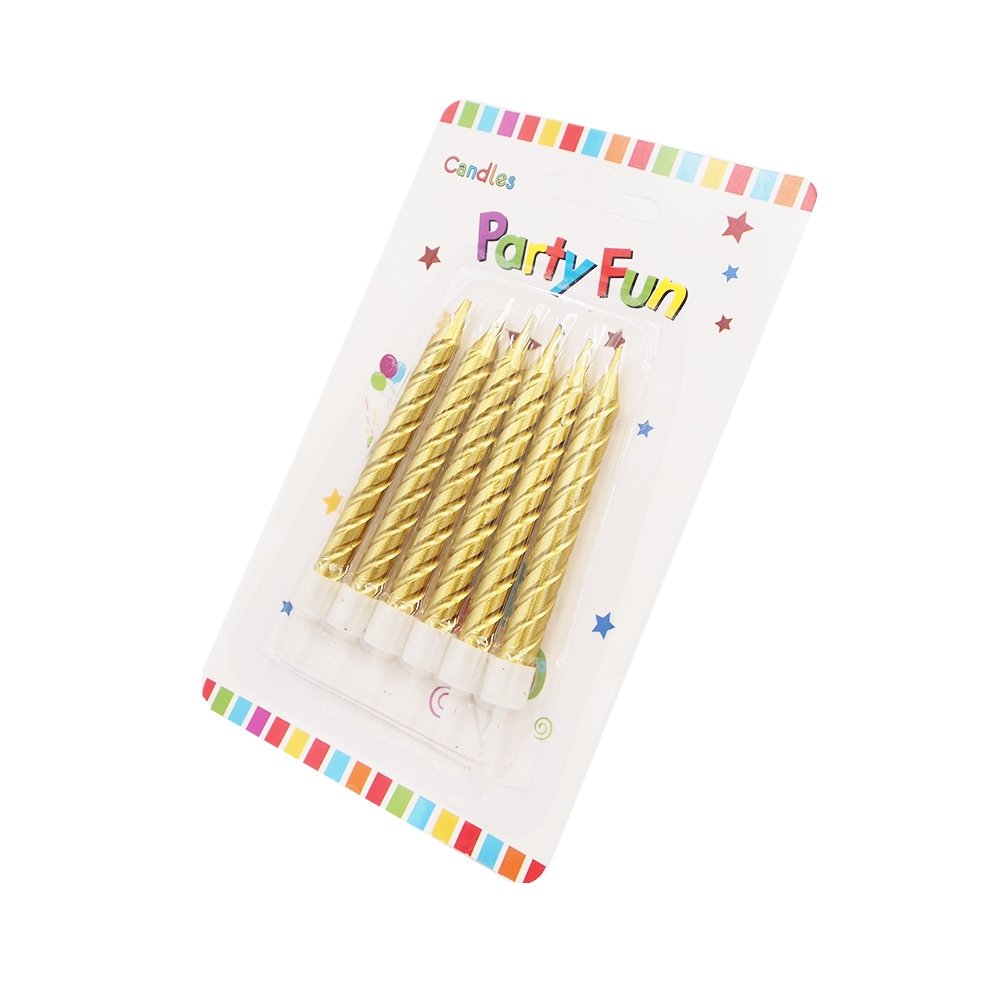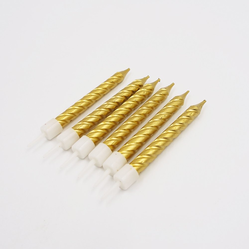 Metalizuotos torto žvakutės, jų paviršius blizgantis.