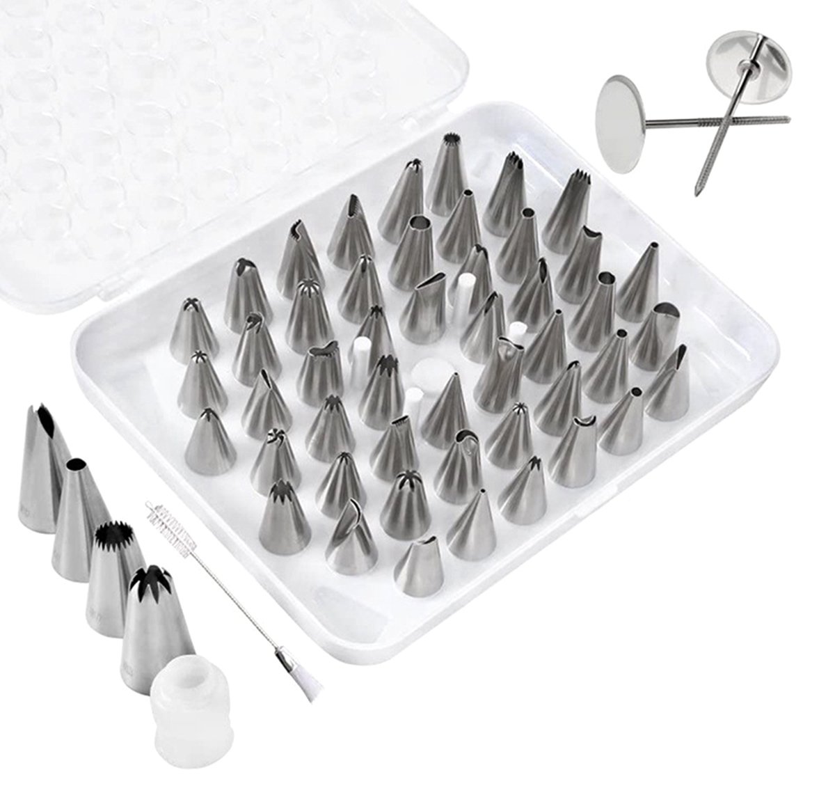 Puikus tortų ir pyragų dekoravimo rinkinys, susidedantis iš net 54 įvairių plieninių antgalių ir nykščių. Juos galima saugiai plauti indaplovėje ir naudoti su maistu! Pridedamas patogus plastikinis dėklas antgaliams laikyti.