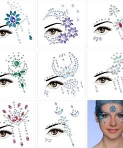 Papuošalai veidui yra lipnūs, todėl veido kristalus lengva prilipti, tiesiog nulupkite nuo pagrindinio popieriaus ir priklijuokite pagal dizainą. Lipdukai atsparūs prakaitui ir vandeniui. Brangakmeniai yra skirti iki 8 valandų nešiojimo. Galima pakartotinai naudoti su blakstienų ar kūno klijais. Taip pat galite naudoti blakstienų klijus, kad padidintumėte lipnumą ir išvengtumėte nukritimo.