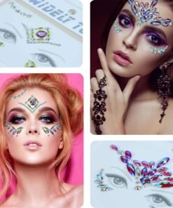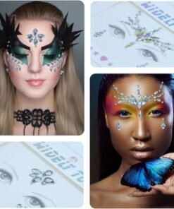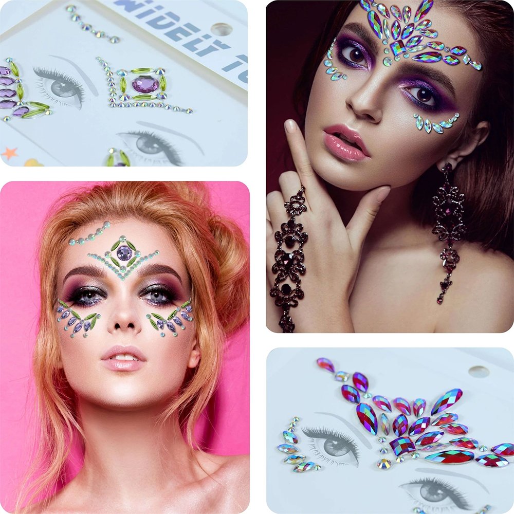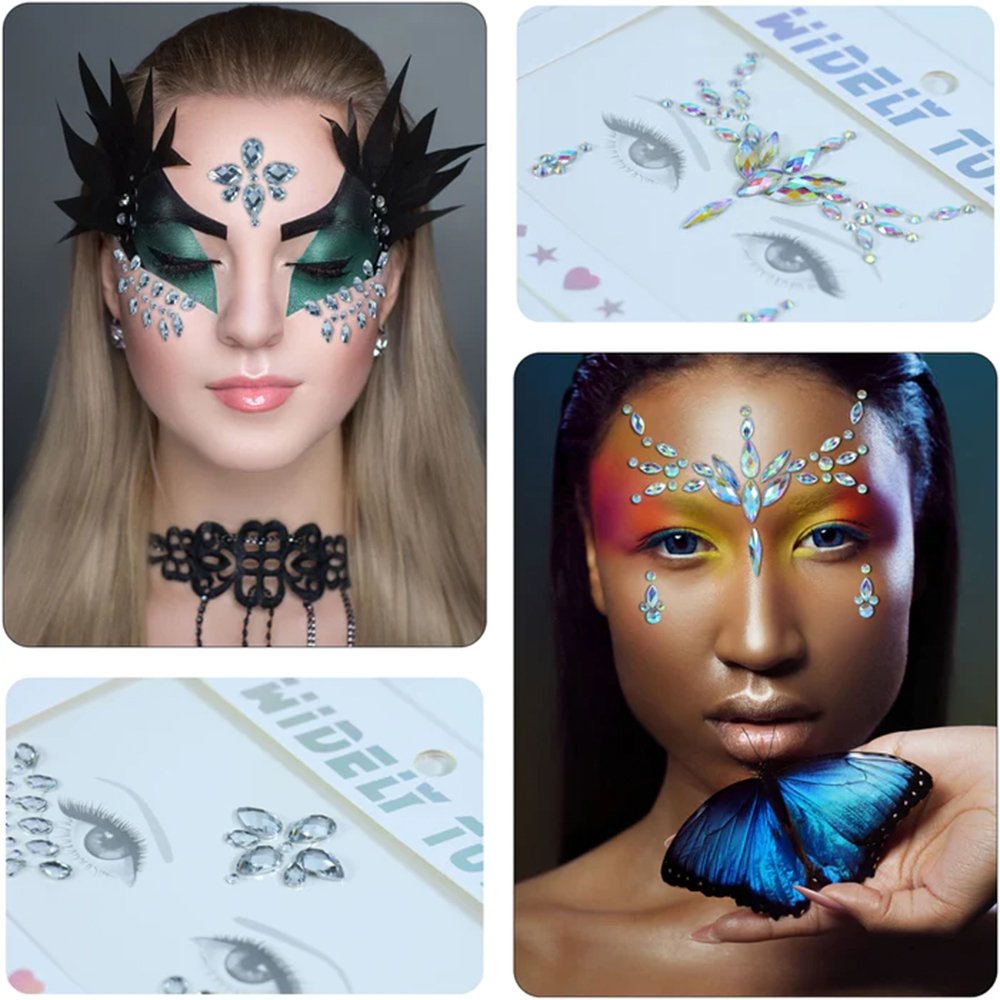 Papuošalai veidui yra lipnūs, todėl veido kristalus lengva prilipti, tiesiog nulupkite nuo pagrindinio popieriaus ir priklijuokite pagal dizainą. Lipdukai atsparūs prakaitui ir vandeniui. Brangakmeniai yra skirti iki 8 valandų nešiojimo. Galima pakartotinai naudoti su blakstienų ar kūno klijais. Taip pat galite naudoti blakstienų klijus, kad padidintumėte lipnumą ir išvengtumėte nukritimo.