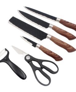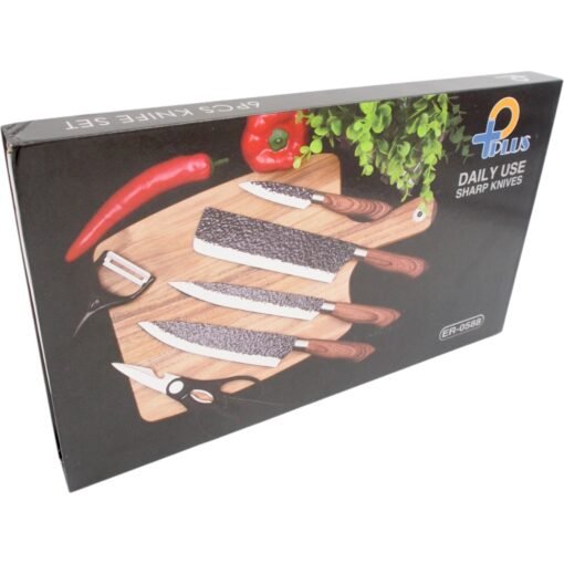 Virtuvinių peilių rinkinys TPLUS 6 vnt. (medžio imitacijos rankenos, plaktos tekstūros ašmenys)