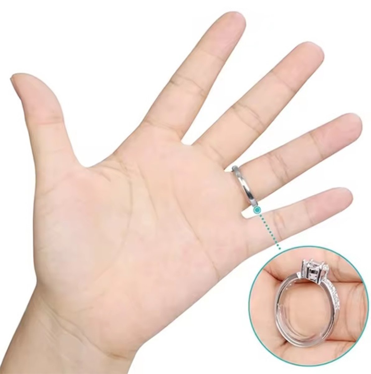 Nematomas žiedo dydžio reguliatorius – rinkinyje 8 vnt. Produktas, leidžiantis greitai priderinti žiedą prie piršto apimties. Skaidrus silikonas puikiai prilimpa prie piršto ir yra nematomas po papuošalais. Rinkinyje net 8 skirtingi pločiai (nuo 2 iki 9,5 mm).
